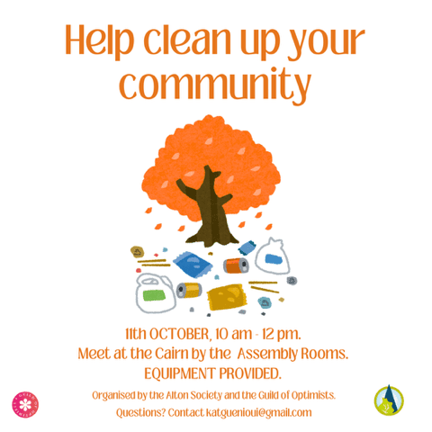 The Alton Society, in collaboration with the Guild of Optimists and supported by Alton Town Council, invites us all to come and support their very popular 2 hour litter pick on Saturday 11th October. Meet at the Cairn next to the Assembly Rooms at 10am. Equipment is provided but if you have your own do bring it along.