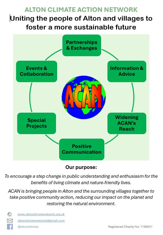 The ACAN Committee, including new Trustees appointed in May 2024, has reviewed and updated the mission and purpose of the Network. Its aim is to unite the people of Alton and villages to foster a more sustainable future.