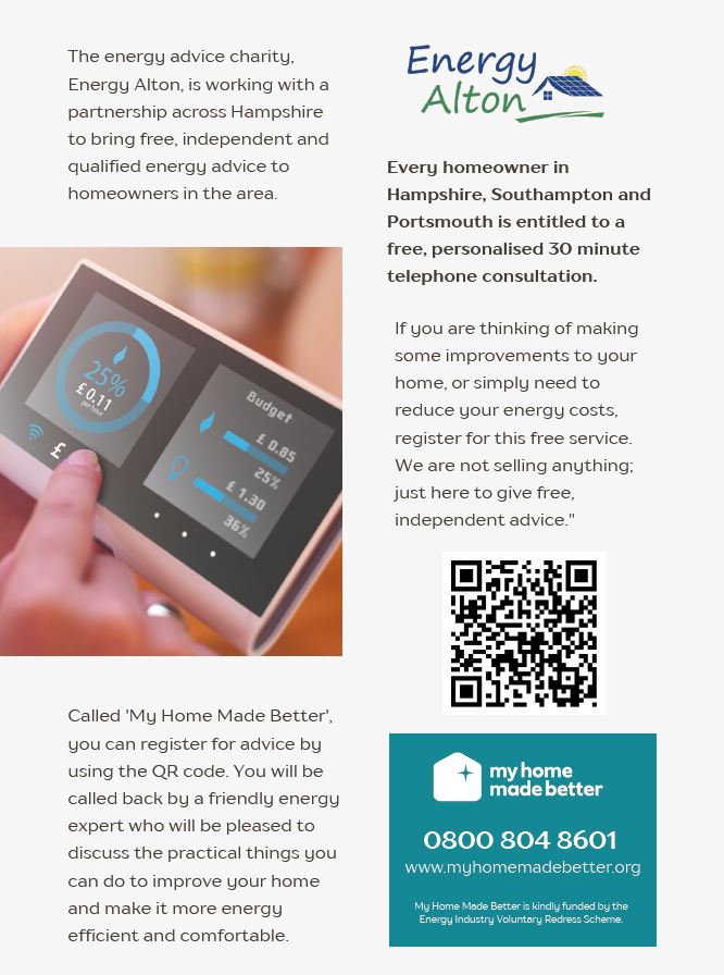 Energy Alton, the Energy advice charity and partner with ACAN, are working with a wider partnership across Hampshire to bring free, independent and qualified energy advice to homeowners in the area.