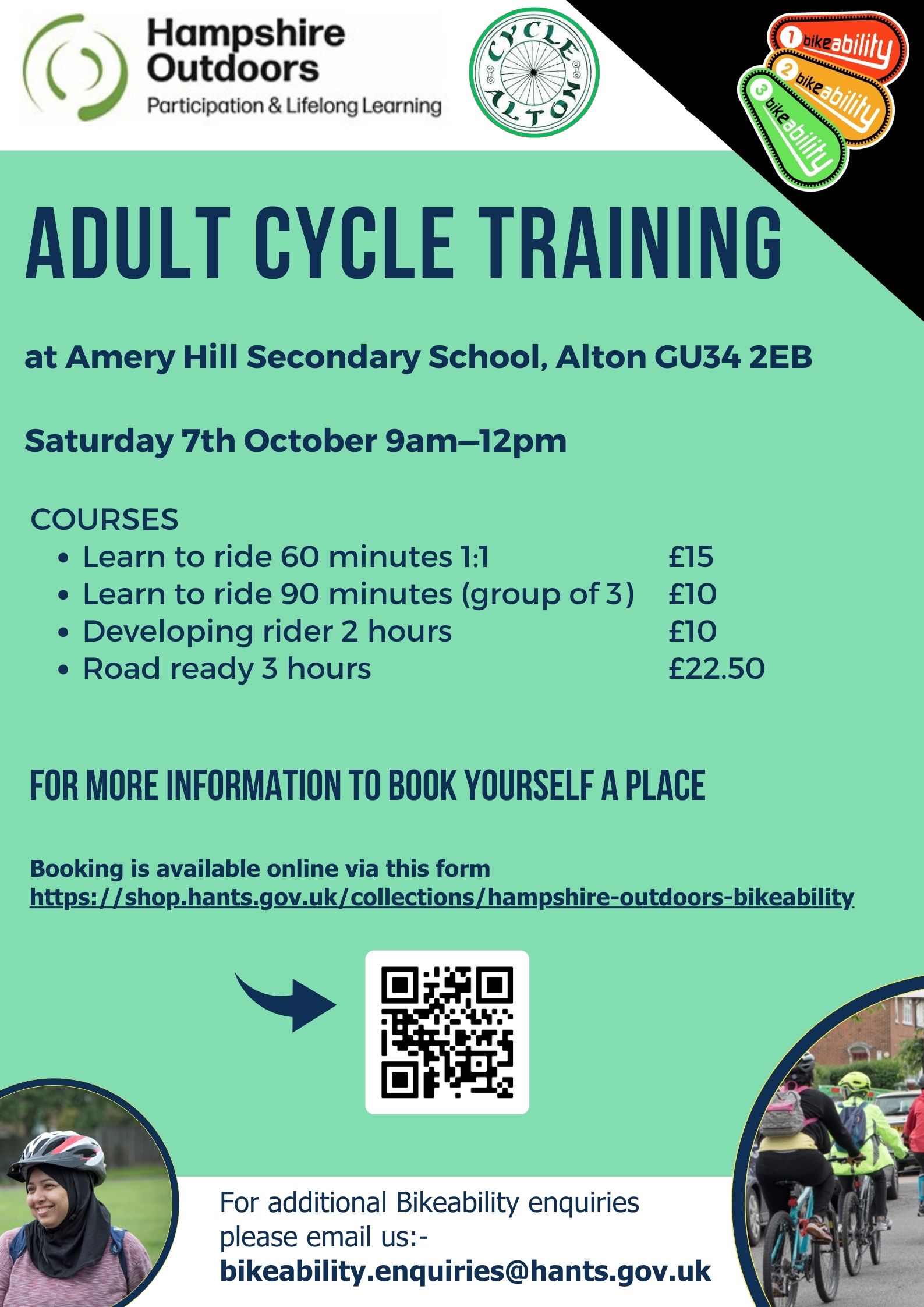 Develop your confidence and skills with riding a bike! The instructors will be qualified cycle trainers who work for Hampshire County Council. The venue is Amery Hill School playground at Amery Hill, Alton, GU34 2EB. Please see the flyer for further details and how to book – places are limited!