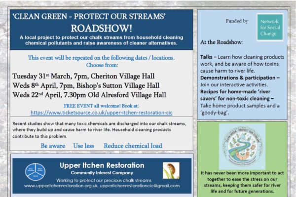 Roadshows by the Upper Itchen Restoration CIC to highlight the impact of everyday chemicals on our rivers, and help folk to make different choices.